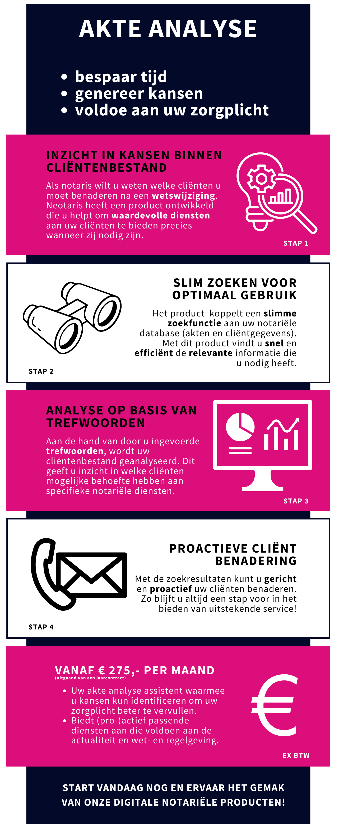 Door uw database (akten in combinatie met cliëntdata) te analyseren naar aanleiding van recente wet- en regelgeving, kunt u kansen identificeren om uw zorgplicht beter te vervullen.